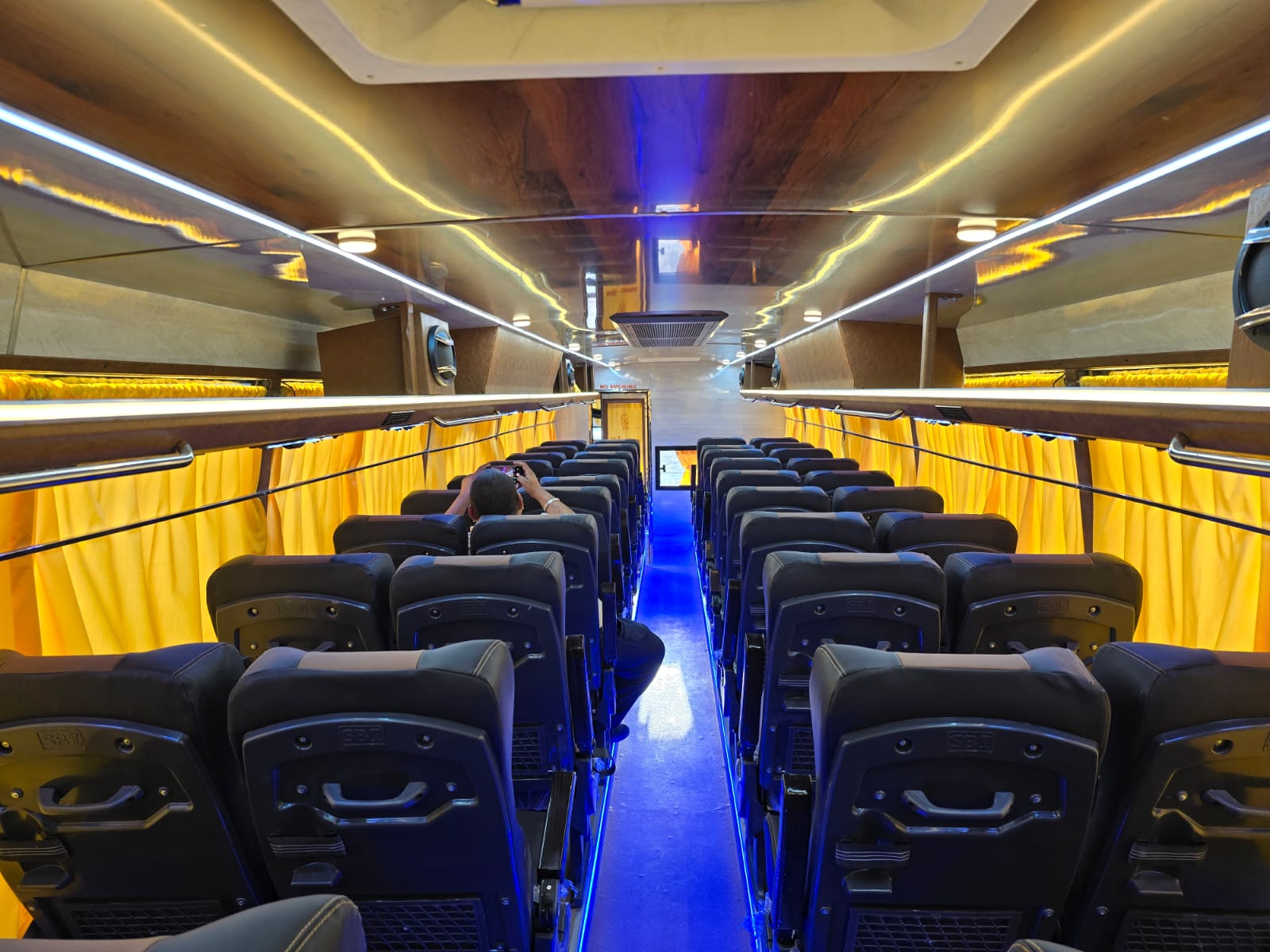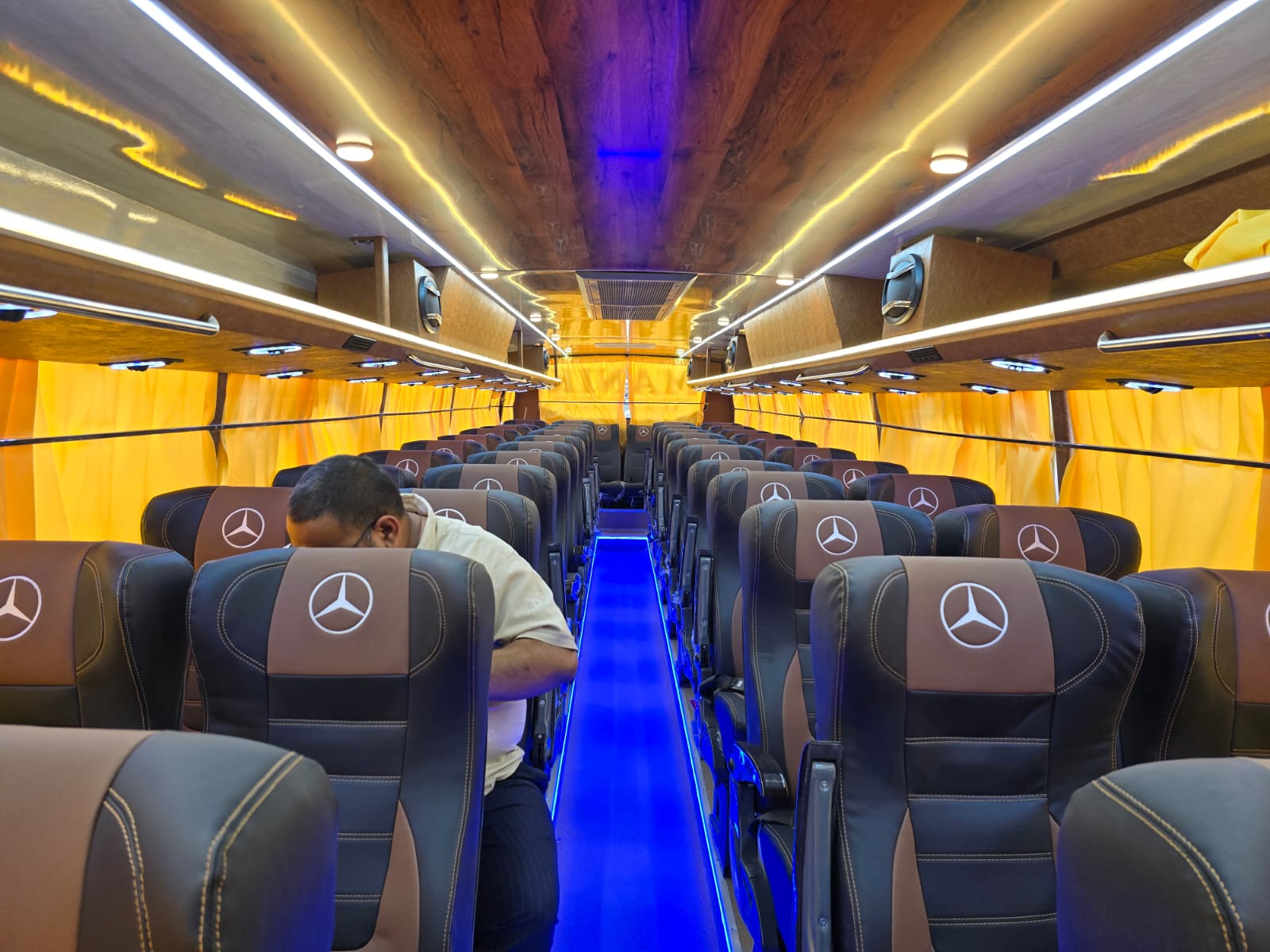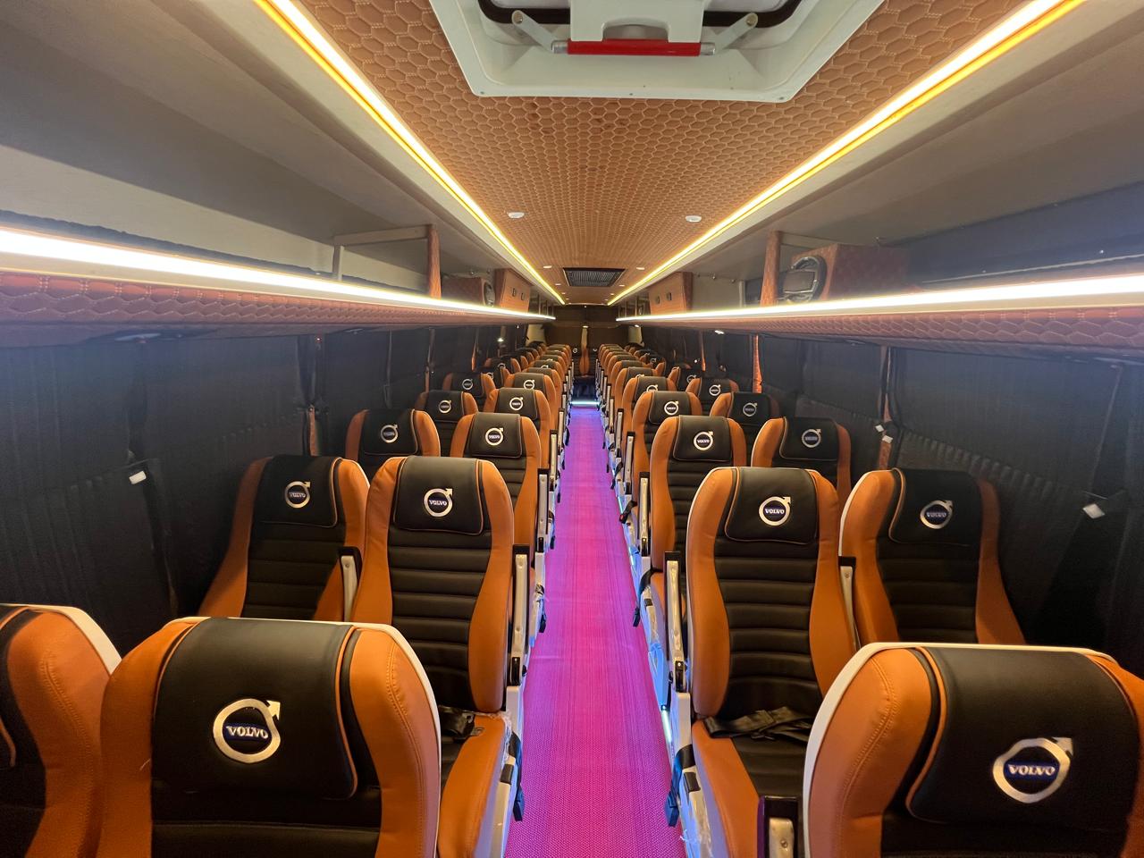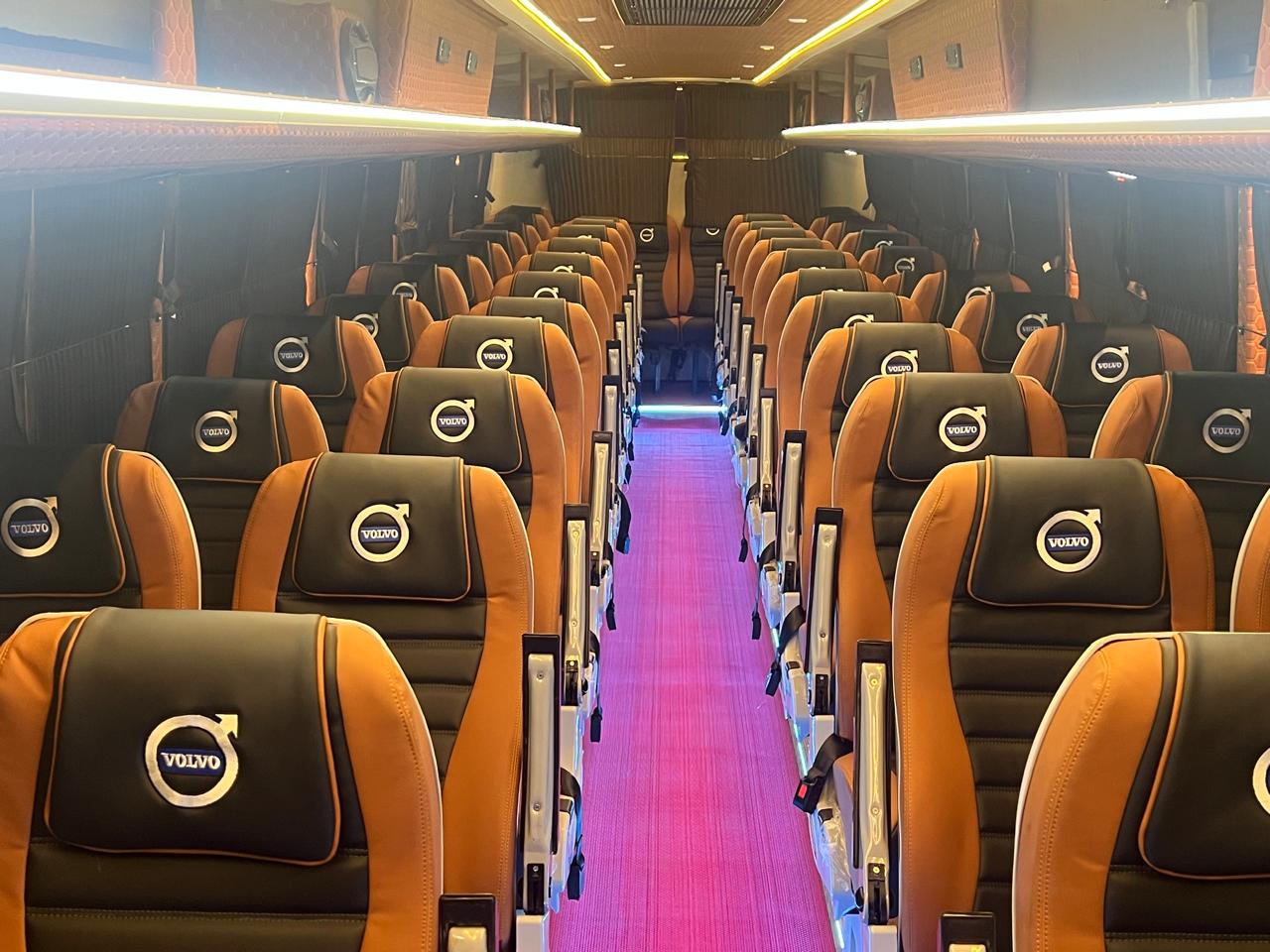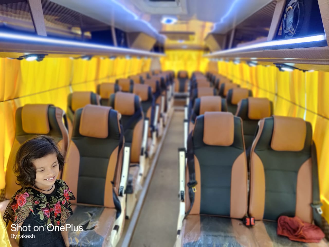 Large side window glasses for better view Comfortable recline seats Music system with surround sound technology Advanced efficient air conditioning with individual AC vents for each seat Best in class leg spacing for best comfort Perfectly positioned reading lights for each seat mobile charging points big boot space for carrying maximum luggage seat belts for each seat air suspension bus